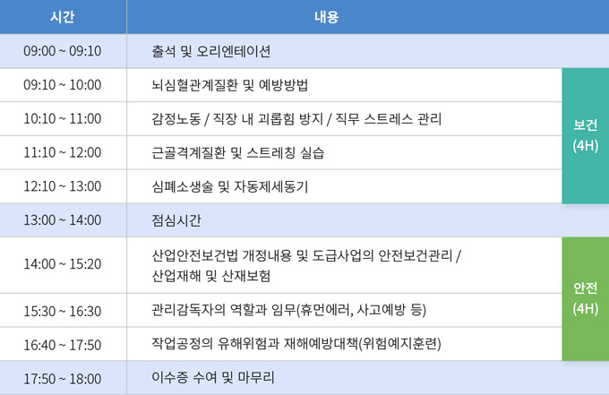 - 교육과정 : 관리감독자 안전보건교육(집체)