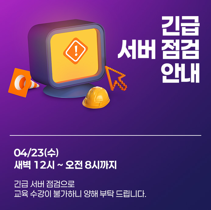 긴급 서버 점검으로 04/23(수) 새벽 12시 ~ 오전 8시까지 교육 수강이 불가하니 양해 부탁 드립니다.
